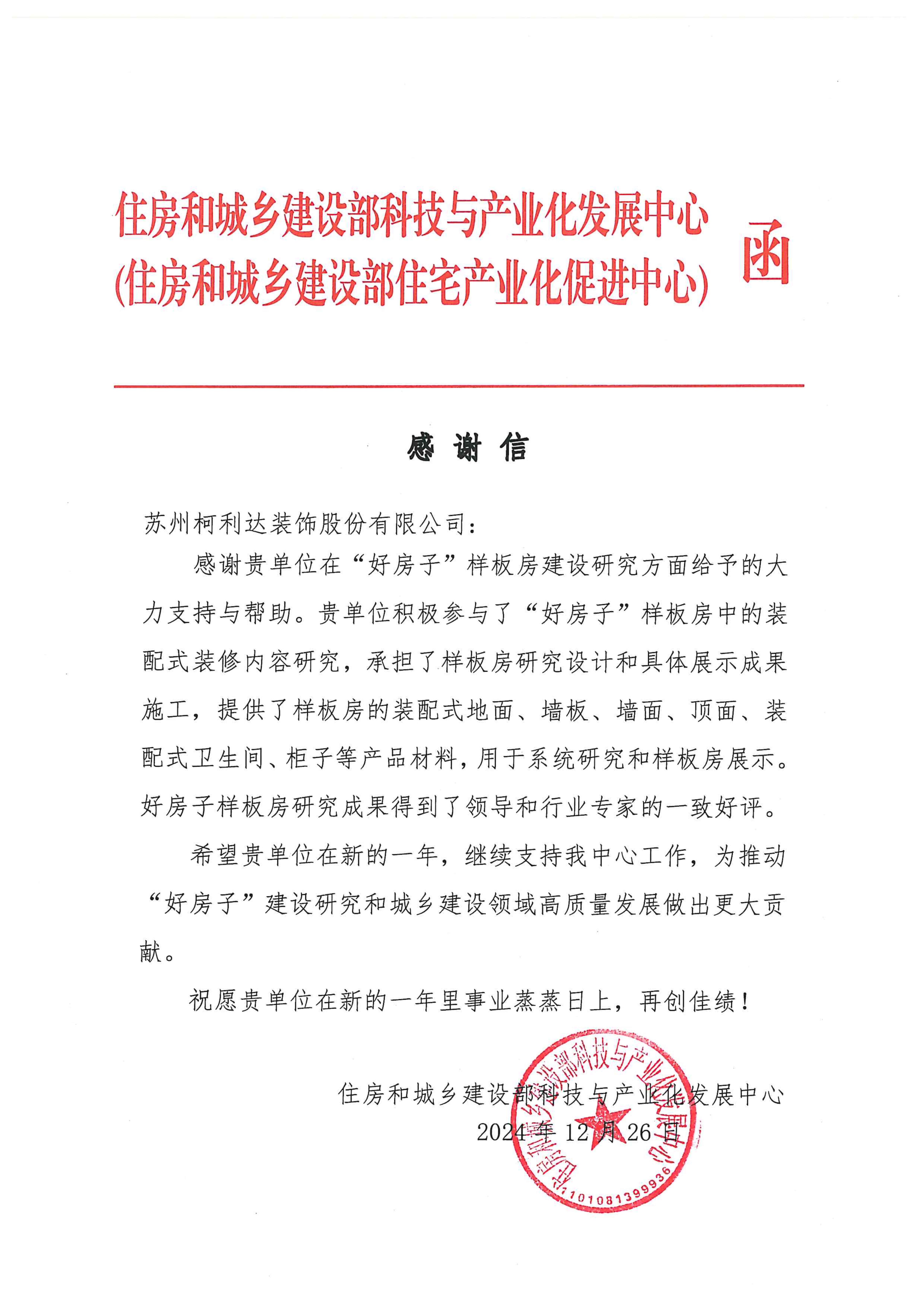 新歲漸近,祥光煥彩。在辭舊迎新之際,柯利達(dá)收到來自住房和城鄉(xiāng)建設(shè)部科技與產(chǎn)業(yè)化發(fā)展中心發(fā)來的感謝信,對公司在“好房子”樣板房建設(shè)研究方面給予的大力支持與